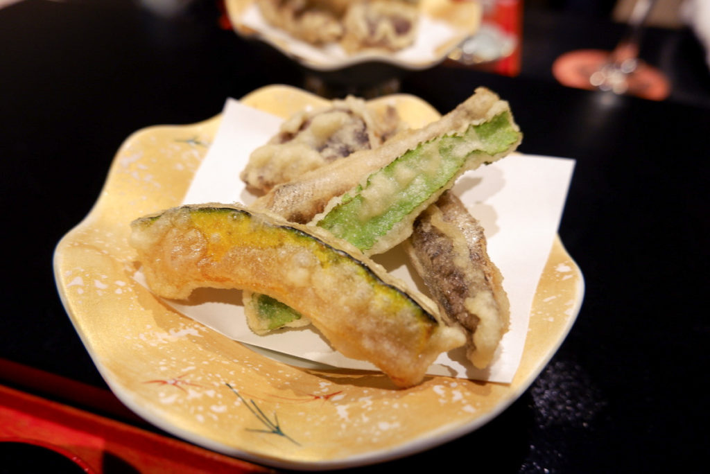 椎茸、四角豆、南瓜、めひかりの天ぷら。サックサクでふっわふわ。