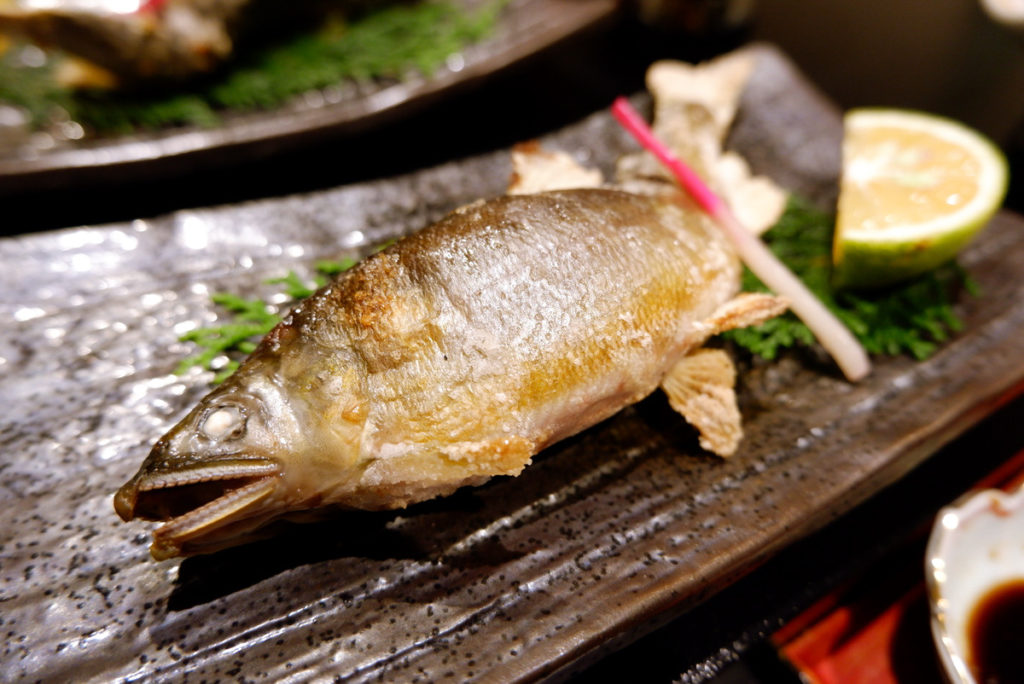 川で泳いでいたのをそのまま焼いたかのような躍動感のある姿焼き。
