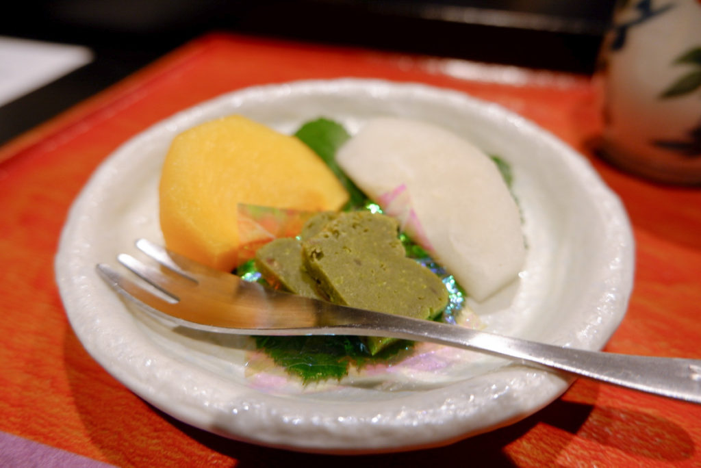 お腹がいっぱいになってもデザートは別腹。釜茶ショコラと柿と梨。