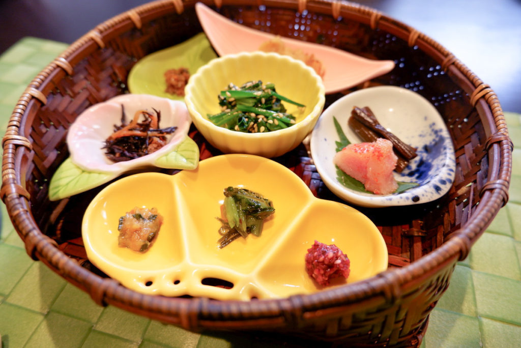 籠に入った小鉢にセンスよく並ぶお料理たち。
