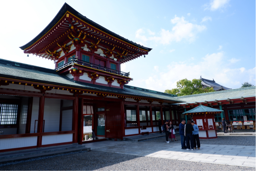 美しい色彩に富んだ楼門と拝殿
